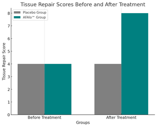 - Tissue Repair Scores Before and After Treatment: Highlights significant improvement in tissue repair capabilities for the AFAlo™ group after supplementation.