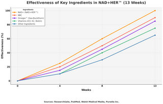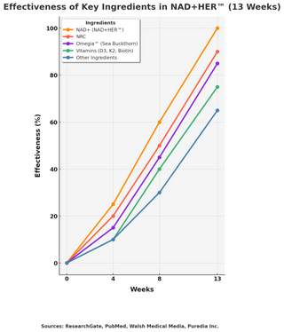 NAD+HER™ shows significant improvements in just thirteen weeks, as demonstrated in the graphs below. This formula, featuring key patented ingredients like NAD+HER™ NAD+ and Omegia™ Sea Buckthorn, supports skin health, collagen production, anti-aging, and immune balance, enhancing women's vitality alongside a healthy diet and regular exercise.